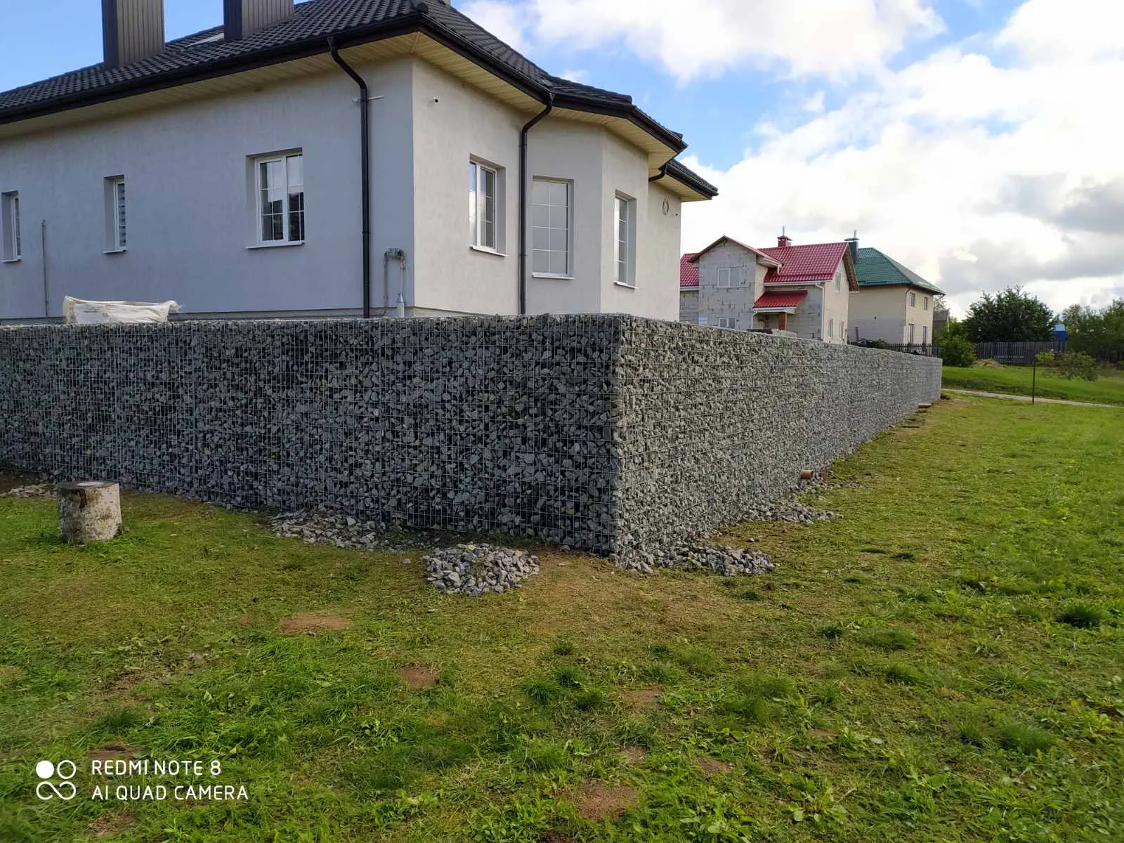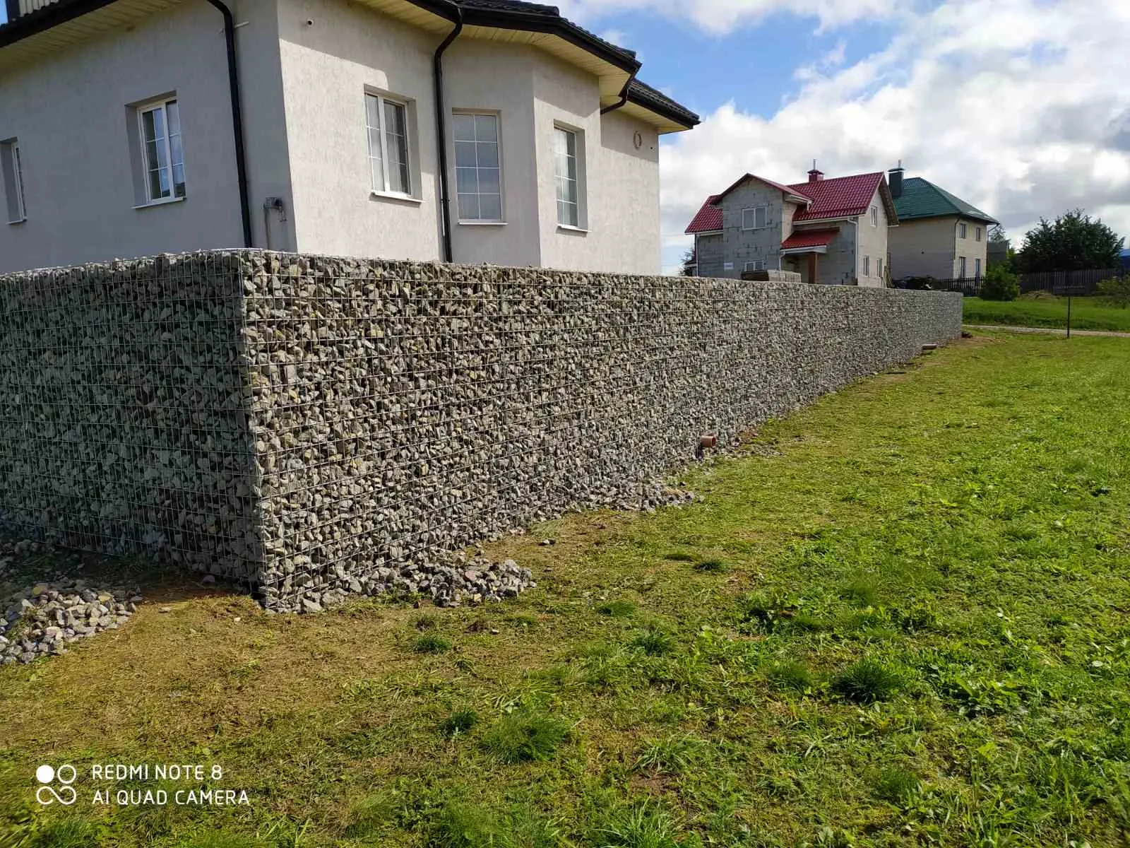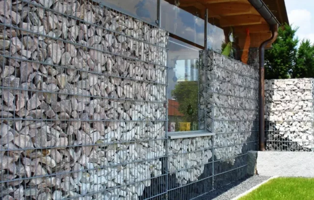 В последнее время отделка из габионов все чаще применяется для придания свежего и натурального вида старым строениям или природного происхождения новым зданиям. В начале, готовят фундамент, затем крепят к стене каркасы из оцинкованной сетки, которые заполняют щебнем, желательно красивым. Такая отделка не требует регулярных ремонтов, не боится дождя и температурных перепадов, органично вписывается в дизайн строений и ландшафт усадеб и дач.