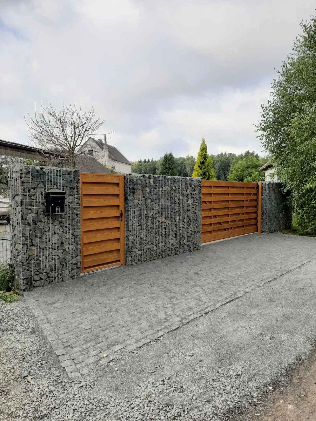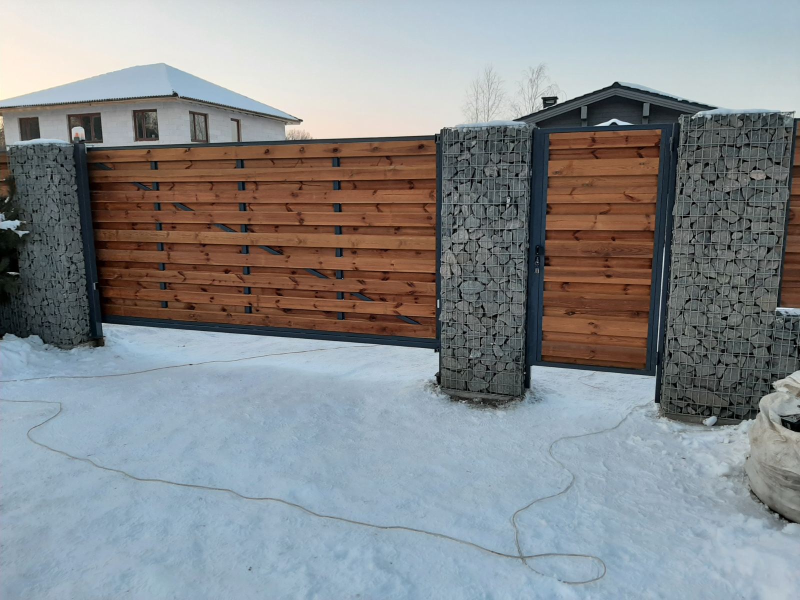 Столбы из натурального камня для откатных ворот придадут роскошности и оригинальности их внешему виду. Габионные столбы очень хорошо сочетаются с входными группами любого из 10 видов дизайна, которые мы предлагаем. Если у Вас уже стоят какие-либо стойки, можно сделать для них отделку из габионов.