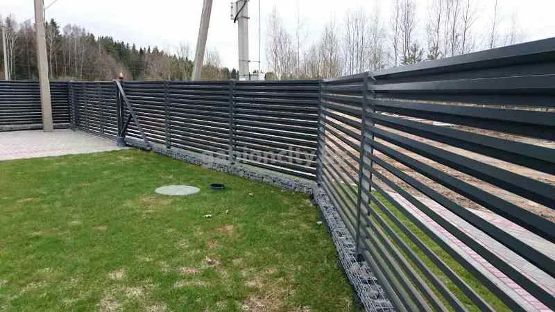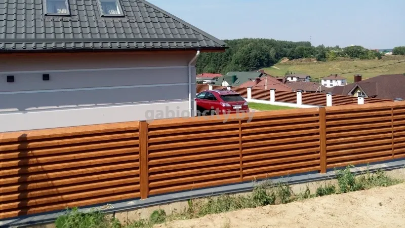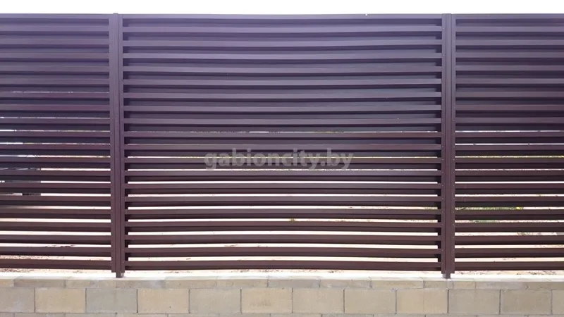 - ПРОЧНОСТЬ. Конструкция жалюзийного забора состоит из жестких ламелей, которые располагаются между торцевыми элементами горизонтально и держатся на опорных столбах. Такая конструкция отличается прочностью и устойчивостью. Данный тип заборов защищает территорию не хуже сплошного ограждения, имеет хорошие звукоизоляционные свойства.